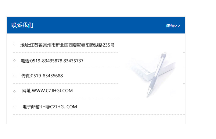 地址:常州市新北區友邦商務大廈1幢16、17層  電話:0519-85101652  傳真:0519-85112595  郵編:213022  網址:www.cz-jiayue_cn.chutianboyi.com  郵箱:xiajifengaa@163.com